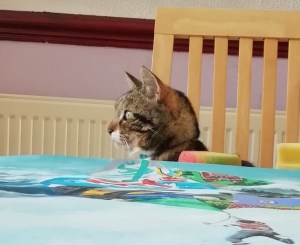 Coco, is showing her age now and she spends a lot of her time fast asleep in her ‘penthouse bed’ – a cardboard box filled with an old towel which envelopes around her when she settles in to sleep. Alternatively, when she gets the opportunity she bullies one of the kids – her victims – into giving way and allowing her to curl up on their lap to sleep there. It’s quite amusing to watch how the pecking order of this household means that as far as this cat is concerned, my kids do not have a say as to whether she can sit on their lap or not.